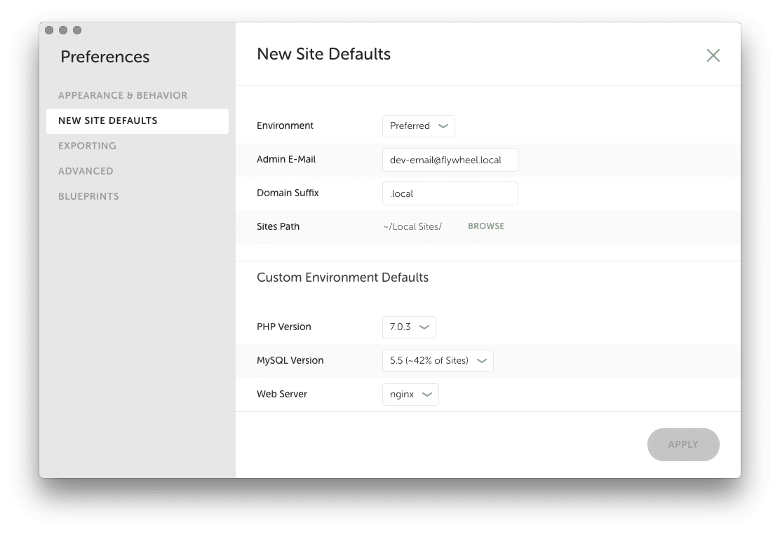 Preferences > New Site Defaults