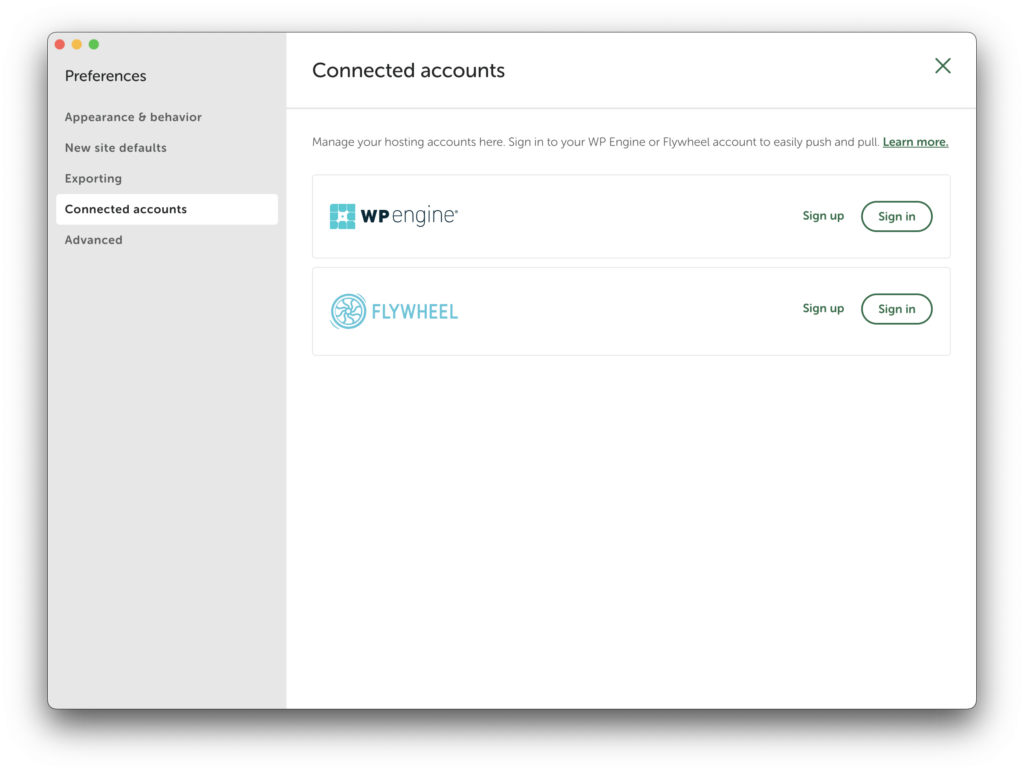 Select “Connect to a platform” to be taken to the “Connected accounts” section of Local’s Preferences. Select the sign in link next to Flywheel.