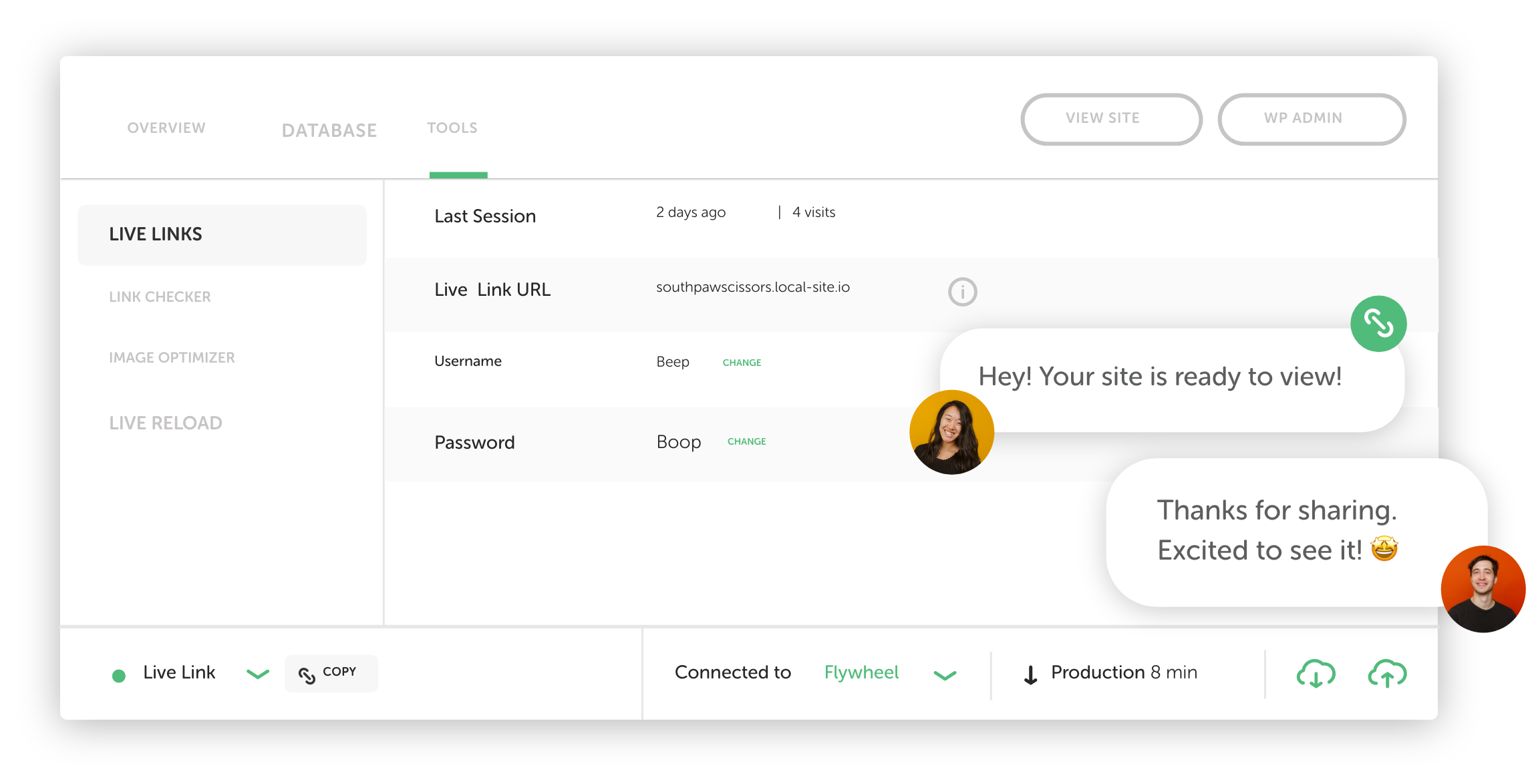 Live Links turns your locally-built site into a working test environment with editable credentials. Send direct links to your clients and coworkers with just a few clicks.